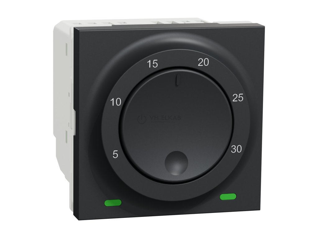 Otočný prostorový termostat (2M) Schneider Electric NU350154 je určen pro přesnou regulaci teploty v místnostech s rozsáhlou kontrolou teploty od 5 °C do 30 °C. Je vybaven šroubovými svorkami pro bezpečné připojení a jednoduchou montáž zacvaknutím. Termostat nabízí LED signalizaci pro zobrazení provozního stavu (zelená pro přítomnost napětí a červená/modrá pro topení/chlazení). Pracuje při napětí 230 V a maximálním proudovém zatížení 8 A. Díky elegantnímu antracitovému designu a montáži zapuštěné do stěny je ideální pro použití v domácnostech i komerčních prostorech. Zařízení má krytí IP20 a je vhodné pro zapuštěnou montáž minimálně ve výšce 1,5 m nad zemí.